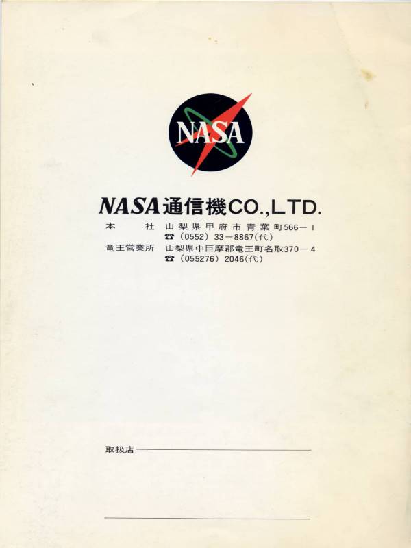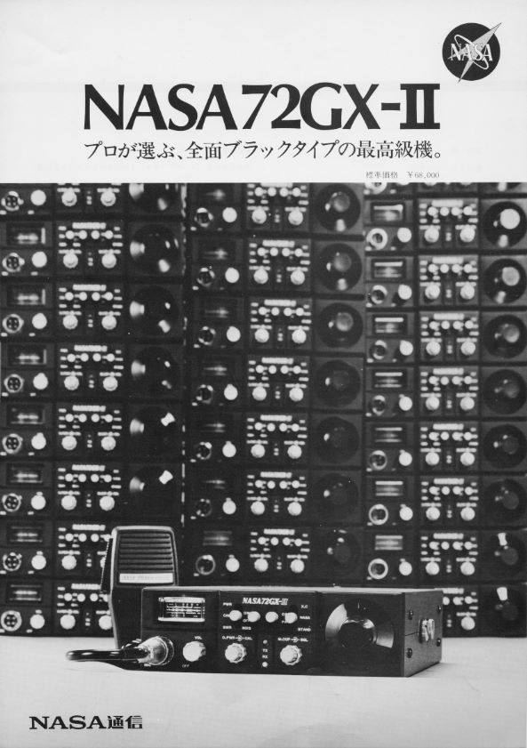 NASA通信、製品カタログです。 信和の業務用無線機の製造代行時代には、NASA通信 で販売と保守を行っていました。 山梨でNECのTK−80(パソコン)を最初に扱い、 山梨大学の卒業性がこぞって就職し、アナウンサー希望 の女性が就職する、ハイテクなメーカーでした。 そんなNASAの黄金時代を象徴するカタログです。 もしNASAが無線に本腰を入れて開発していたなら 現在のアマチュアメーカーと肩を並べるメーカーに なっていたかも知れません。 他業種を手広くやり過ぎた気がします。 CBの豪華なカタログは、JCFが輸出用CB機の運用 を合法化に向けて精力的に活動していた時代の物で、 NASA通信もJCFの活動を精力的にバックアップして いました。 モデルさん達の服装が、年代を感じさせます。 NASA通信に訪問したときの写真が出てきました。 NASA通信に訪問 NASAの無線機 72GXシリーズ以前のCB機 72GXシリーズのCB機 |