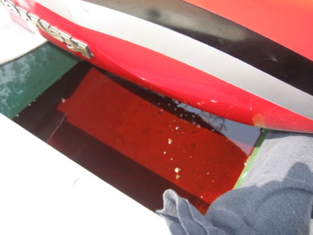 まずは、タンクの中の腐ったガソリンを抜きます。赤茶色のガソリンが出て来ました。この作業は風の強い日がお勧めです。何故かって?臭いからです、家族からクレーム続出でした・・・